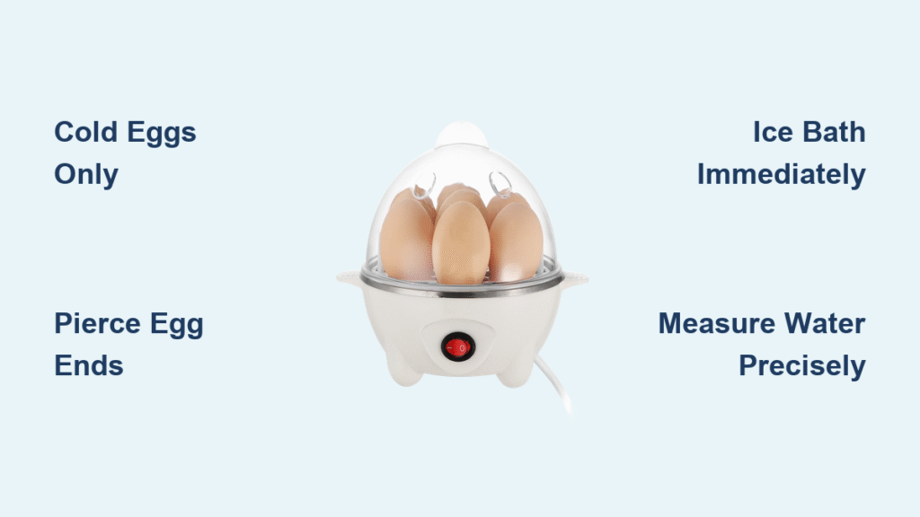 Critical step: Pierce the wider end of each egg using the measuring cup’s built-in needle. This microscopic hole releases internal pressure during steaming, preventing 95% of cracks. Keep pierced ends facing up so moisture doesn’t leak into the egg. Never force eggs into tight slots—that causes shell fractures before cooking even begins.