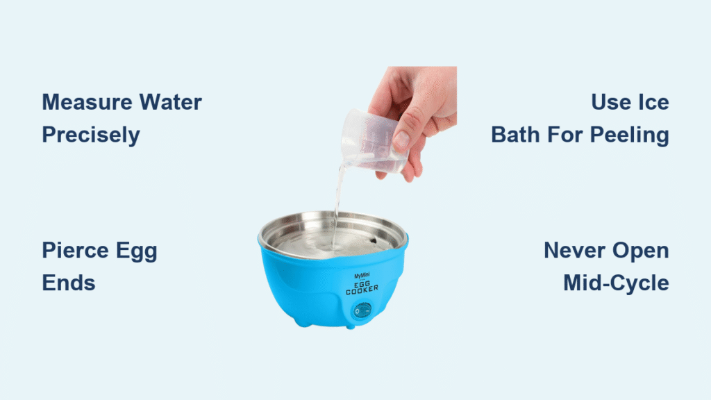 Pour the measured water directly onto the heating plate, ensuring it spreads evenly across the surface. This water creates the steam that cooks your eggs precisely. Critical mistake to avoid: Never eyeball the water level—use only the provided cup. Even 5ml too much water creates excessive steam pressure that cracks shells.