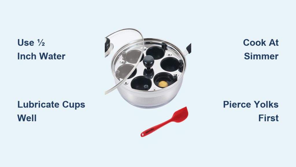 Fill your cooker base with exactly ½ inch (1.3 cm) of water – enough to touch cup bottoms when inserted but not submerge them. This measurement is non-negotiable across all cooker types. Too little water causes hot spots and uneven cooking; too much leads to splashing and messy whites. Use cold water for stovetop models to prevent premature cooking during heating. For electric units, always follow manufacturer measurements as they vary significantly.