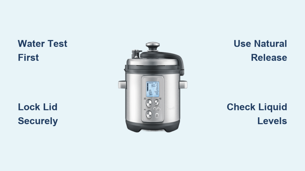 Before cooking real food, validate your Breville pressure cooker’s operation with this manufacturer-recommended safety check. Skipping this step risks improper sealing or pressure buildup during actual cooking, potentially triggering safety mechanisms that interrupt your meal preparation.